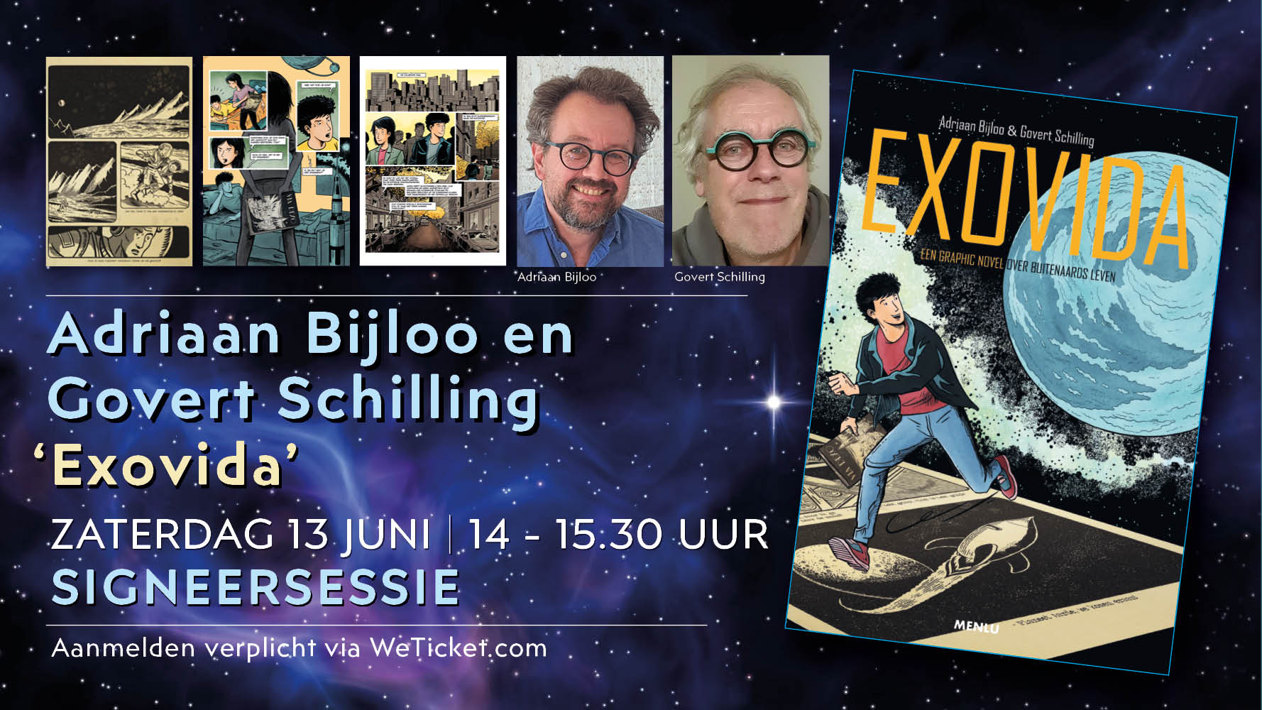 Illustrator Adriaan Bijloo en wetenschapsjournalist Govert Schilling verweven feiten en fictie, historische verhalen en hedendaagse inzichten, en een grote verscheidenheid aan tekenstijlen in een spannend, informatief en gelaagd avontuur rond de grootste vraag die de mensheid zich ooit heeft gesteld: zij wij alleen in het heelal? Wil je bij deze signeersessie aanwezig zijn, meld je aan!