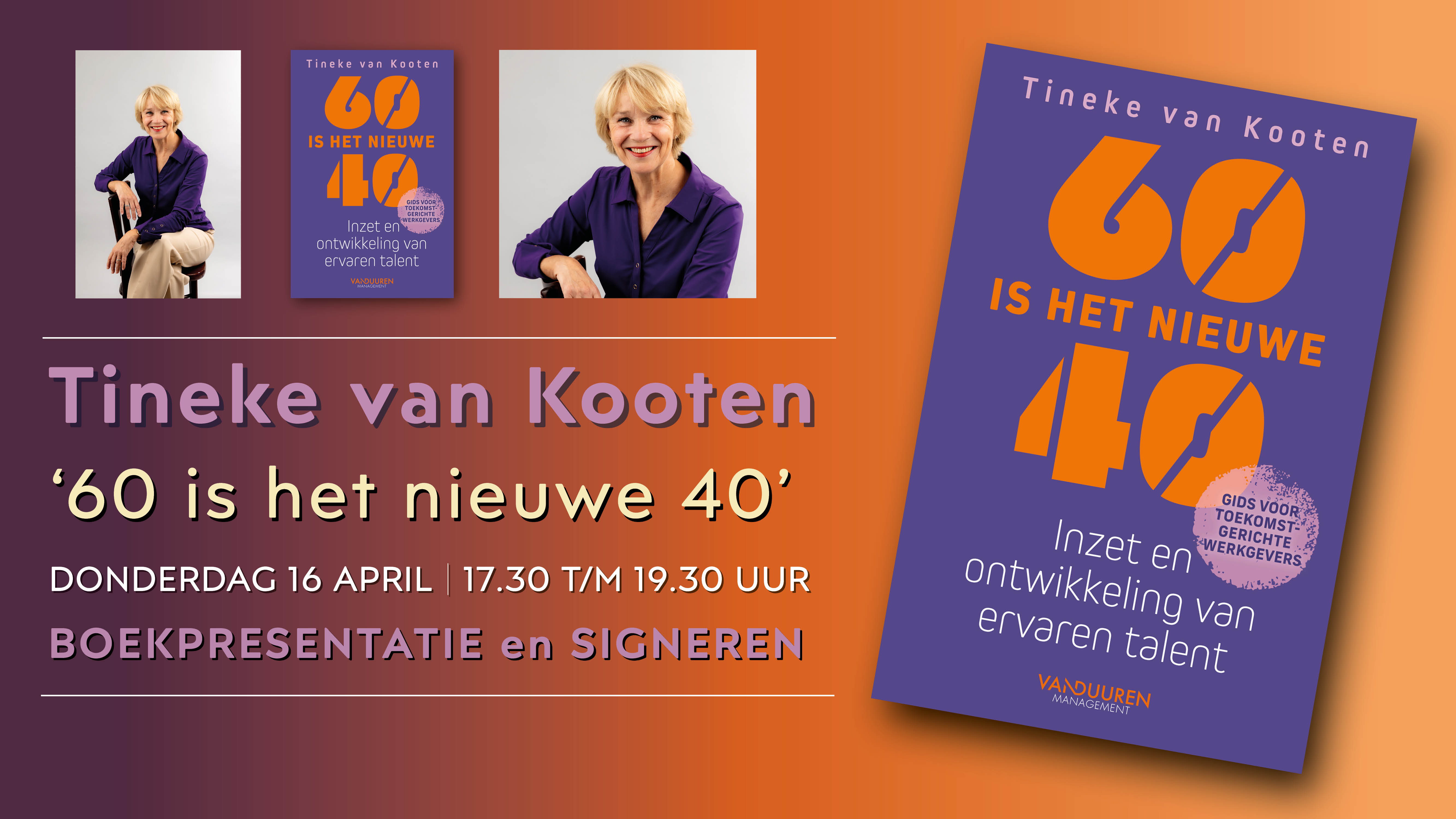 Op donderdag 16 april presenteert Tineke van Kooten, in samenwerking met Uitgeverij Van Duuren Management, haar nieuwe boek bij Broese: ‘60 is het nieuwe 40’. Dit boek dient als gids voor toekomstgerichte werkgevers die de ervaringskennis van hun (ouder wordende) werknemers optimaal willen benutten, en hen de ruimte willen bieden voor ontwikkeling en werkplezier. Tijdens de boekpresentatie vertelt Tineke van Kooten meer over de totstandkoming van haar boek, beantwoord ze vragen uit het publiek en zal ze natuurlijk signeren! Wilt u deze presentatie niet missen, meld u dan aan!